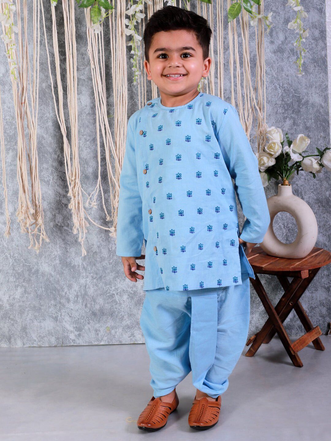 Indulge in luxury with our Embroidered Full Sleeve Cotton Kurta with Dhoti in Blue. Made with the finest quality cotton, this elegant kurta features delicate embroidery and full sleeves for a sophisticated look. Complete the ensemble with our stylish dhoti, perfect for any occasion.