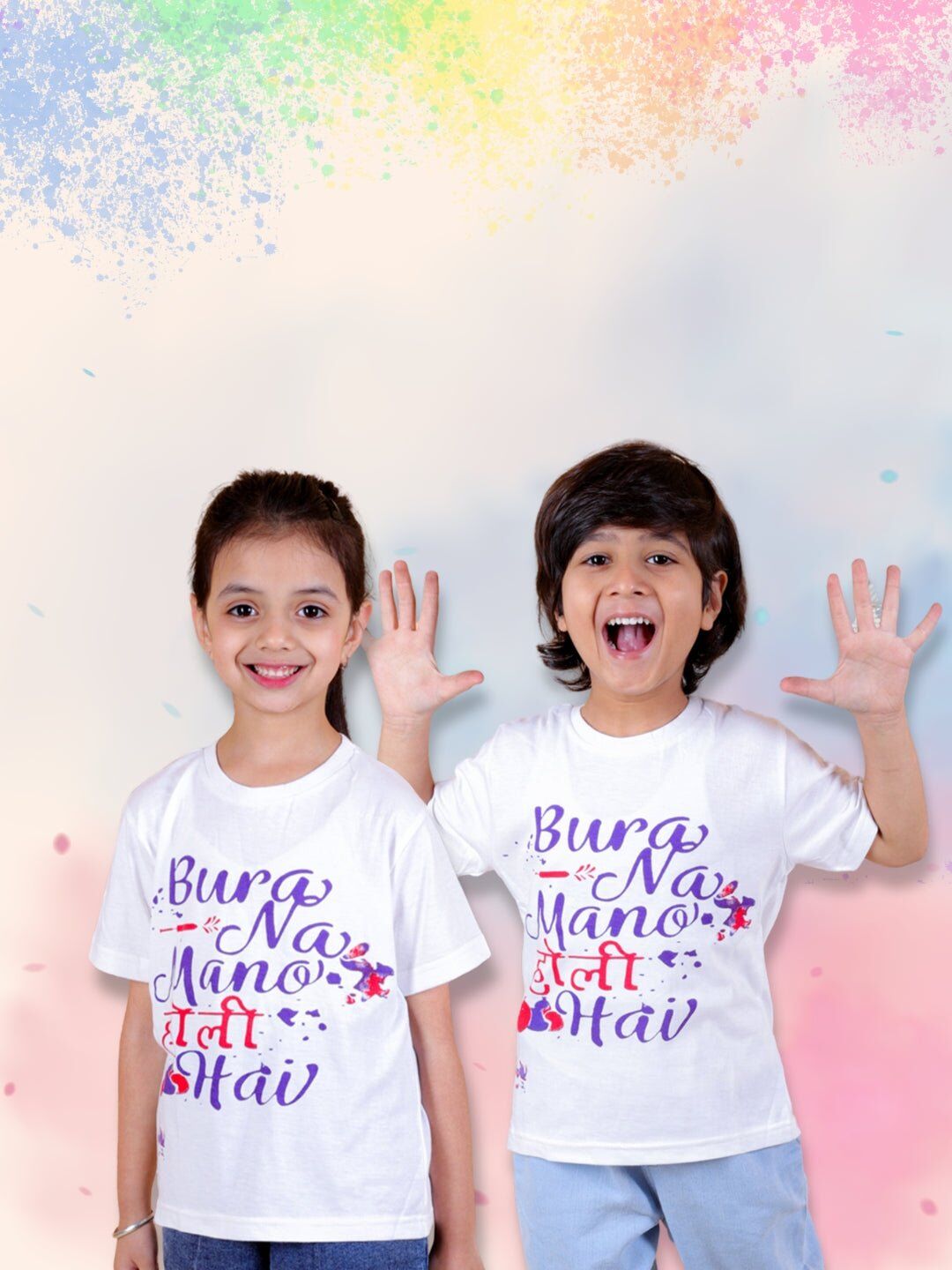Elevate your little ones’ style with Sibling Sets. These exclusive Bura na Mano Holi Hai printed t-shirts feature a half sleeve design and round neck, adding a touch of sophistication to your kids’ wardrobe. Perfect for siblings, these t-shirts are a must-have for a stylish family outing.