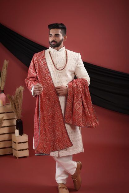 Exquisite Off White Silk Embroidered Sherwani Set with Detailed Dupatta